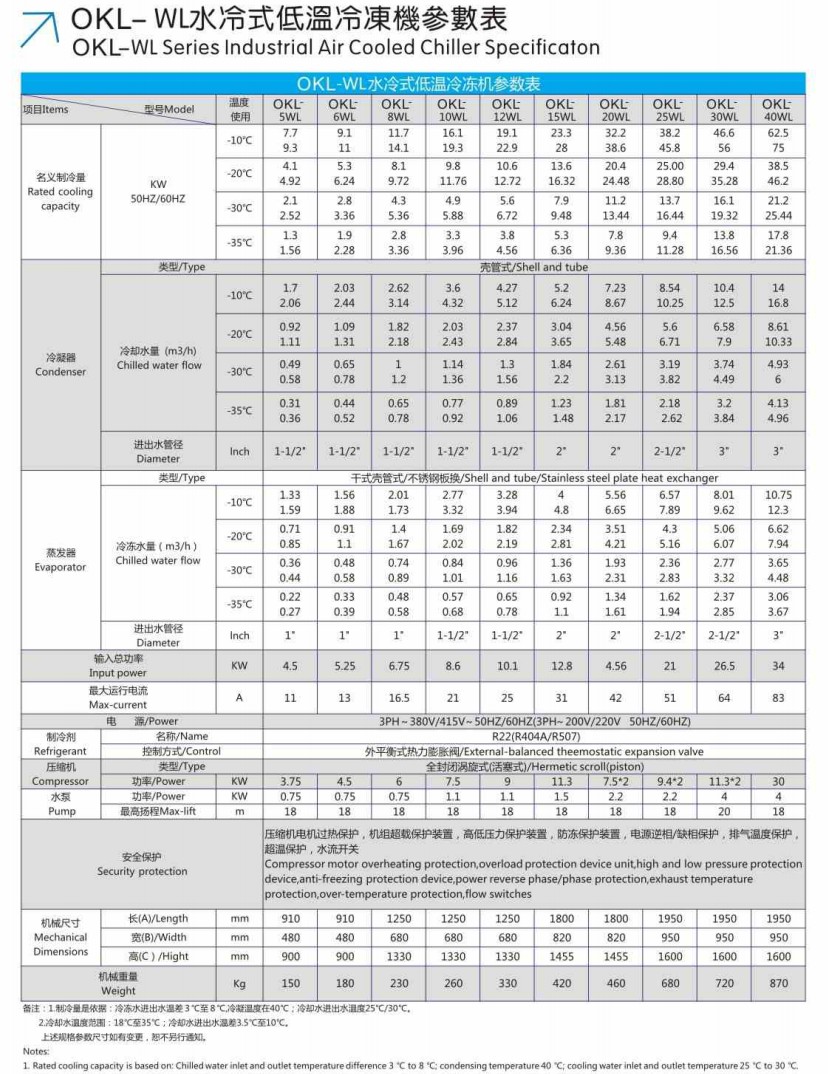 歐科隆牌冷水機全部工業冷水機組保護系統裝置有:溫度控制開關、防凍開關、可熔栓、高低壓壓力開關、過載保護器,壓縮機過熱保護器,壓縮機頻繁啟動保護器及異常指示燈。